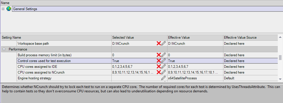 The Control Cores Used For Test Execution setting defines a new mode of operation for the NCrunch engine, in which the engine will attempt to control the CPU cores on which test code will run. In this way, tests are allocated fixed CPU resources for their execution, rather than relying on the O/S to pool CPU resources across all runner processes.
